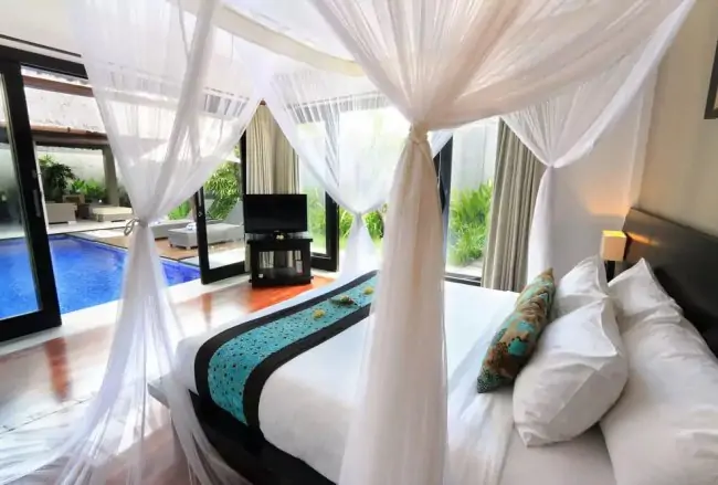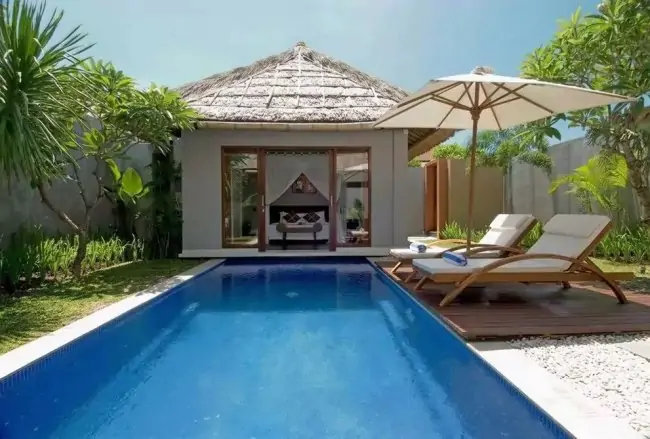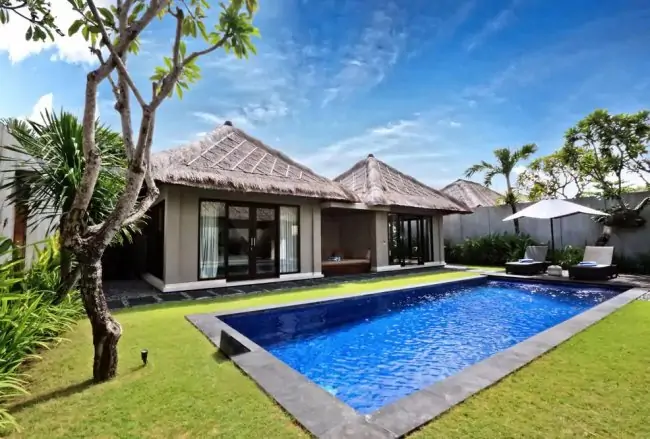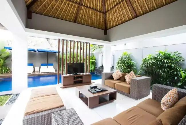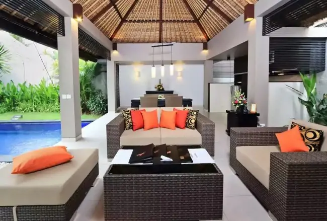five Two Bedroom Pool Villas of Jerami Seminyak Villas are configured with one double bed and one twin bed and are complete with a private swimming pool, private kitchenette, living room and butler service. Â Emulating the traditional Balinese concept of outdoor living, specific areas are exposed to the elements, thereby allowing plenty of natural light and healthy air circulation. Two-bedroom villas can accommodate a maximum of four adults and two children. All rates are for four people.
