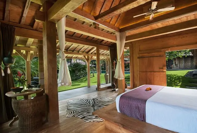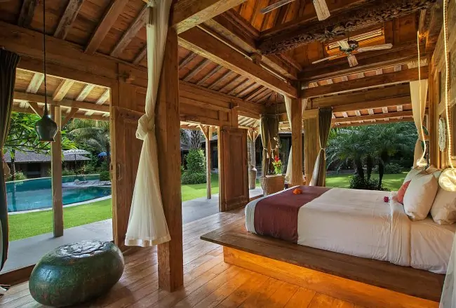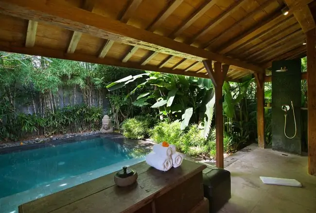 Kalua, located in the residential area of Umalas only 10 minutes from Seminyak and 40 minutes from the airport, is a haven of peace. Kalua, the Exotic and its lotus pond is the smallest of three villas in the complex, wood double room, minimum size of 30m2 and private bathroom half open, one with small pool 20m2. The bungalows, in antic teak , from the island of Java, are shelled around a beautiful clover-shaped pool, where a Goddess statue made from lava stone, caresses you under her protective gaze.