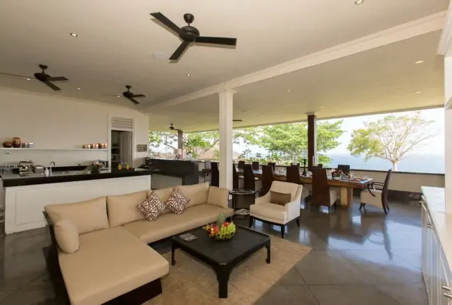 The dining table sits for 6 persons located in Dining Area. There is wine cellar for keeping your wine on right temperature. Kitchen itself already equipped with cutleries, oven grill and gas stove. There also a Teppanyaki Grill gazebo in The Karang Nusa. The second floor access to lounge area. Enhance with direct sea breeze, this open space living area suits for chit chat.