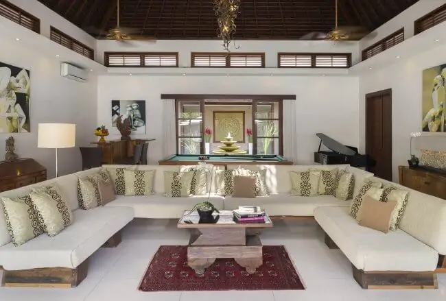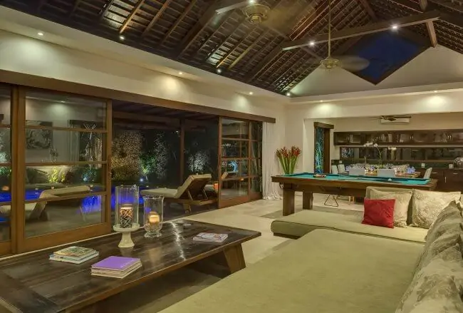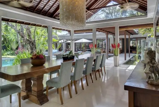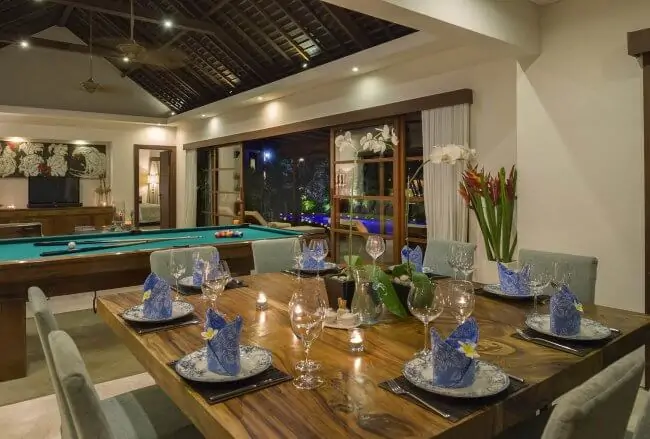 - Air-conditioned living room; open-sided dining pavilion with table for 16; media room; poolside balé; joglo entertainment pavilion.