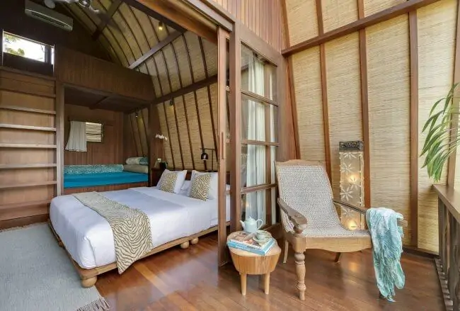 Lataliana II is a charming two-bedroom villa with contemporary architecture inspired by Indonesian vernacular design. The property, which was completed in 2011, sleeps up to four adults and two children in two separate buildings positioned on opposite sides of a 15-metre swimming pool within the boundaries of a tree- and flower-filled garden. One of the buildings, modelled on a traditional rice barn or lumbung, was designed specifically with families in mind.