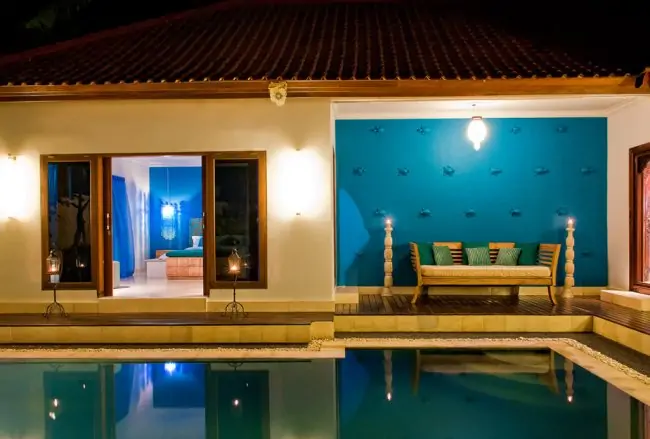 Funky in design and modern styling Sea Villa Seminyak is an intimate, two-bedroom villa that oozes fun and sophistication in a location designed to bring the tropical ocean to your very feet. Painted in white and aquamarine the villa recreates the soft and gentle emotions that flow from being on or near the ocean. Add to this the colour of the sky reflected in the 8 metre swimming pool that dominates the garden and you have a recipe for serene living and the perfect holiday destination. This Seminyak villas of Sea Villa is furnished for comfort with king-sized beds and warm deep sofas, and just to add to the ambience of the sea, a flotilla of blue painted terracotta turtles seem to swim around the inside of the villa while six huge, round shell chandeliers in many shades of blue shimmers in the breeze and bring the sounds of nature into your life.