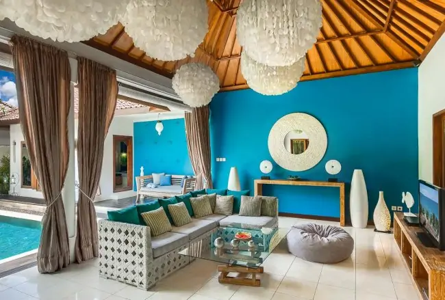 Sea Villa Seminyak is a relaxing and serene holiday haven with modern interiors and sleek funky designs that will appeal to any hip young things with an eye for beauty and fun. Painted in aquamarine with terracotta turtles swimming along the walls the L-shaped villa is dominated by an 8 metre pool in the garden, filled with palm trees, frangipani, heliconia and some white and blue colour flowers. The open sided living / dining area has a fully-equipped kitchenette and a glass dining table for six and sits on under a high-pitched ceiling from which are suspended six large round blue and white shell chandeliers which shimmer and clink in the breeze. A comfortable rattan couch with soft furnishings and cushions facing a media centre, including large 42″ flat screen TV, DVD player with surround sound system, iPod dock and some cables you may need to connect your laptop to TV to watch your favourite movie from private collection. Selection of 60 international TV channels connected as well as wireless Internet that available in every place of the villa. Finally, long flowing organza curtains bring colour and elegance to the room while creating a transition between indoors and outdoors.
