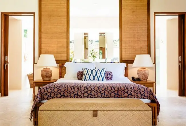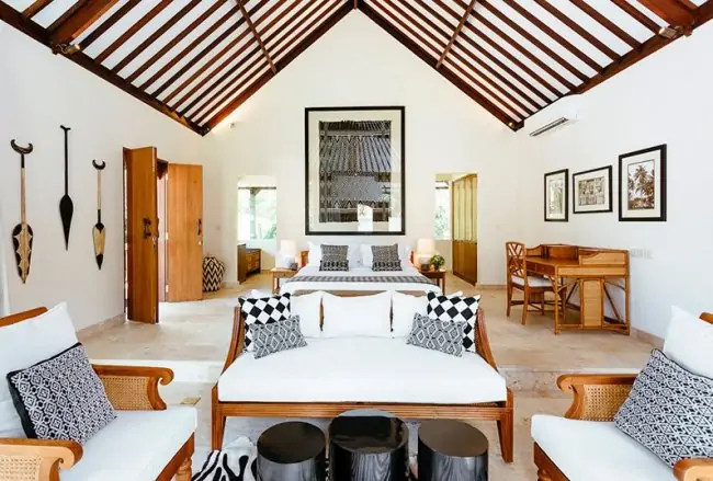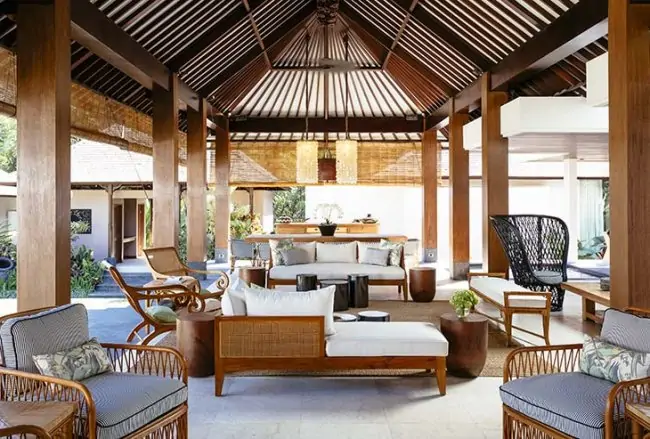 Entering the main open air living and dining pavilion, guests will step over ornamental ponds fed by gin-clear natural spring water. With a large dining table at one end and a bar at the other, this raised pavilion presides over the garden and is furnished with comfy daybeds and sofas, a big coffee table and Buddha lamp stands.