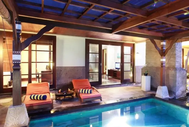 Set between the two bedrooms, the warm living and dinning are overlooking the garden featuring the plunge pool with its wooden deck, a flower canopy, a bale, and pond and fountain. The Residence offers a wide range of facilities both provided by the hotel such as fitness center, Jacuzzi, sauna, massage… and in the surrounding with the 18 holes golf course, the Nusa Dua Beach, Art Gallery, Shopping Center.