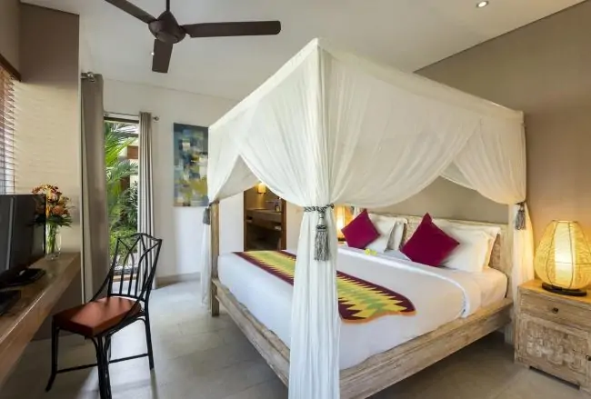 This Seminyak villas rental, Villa Abakoi’s master bedroom is located in ground level seperate with another 2 storey pavilion. Completed with Ceiling fan and Air conditionned, king sized bed, cabled TV, DVD player, ensuite bathroom with large bathtub, rain shower, 2 washbasins, walk-in closets with mini-bar and safe.