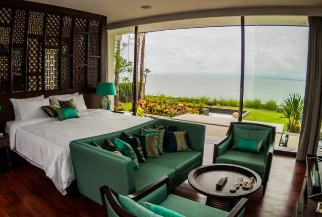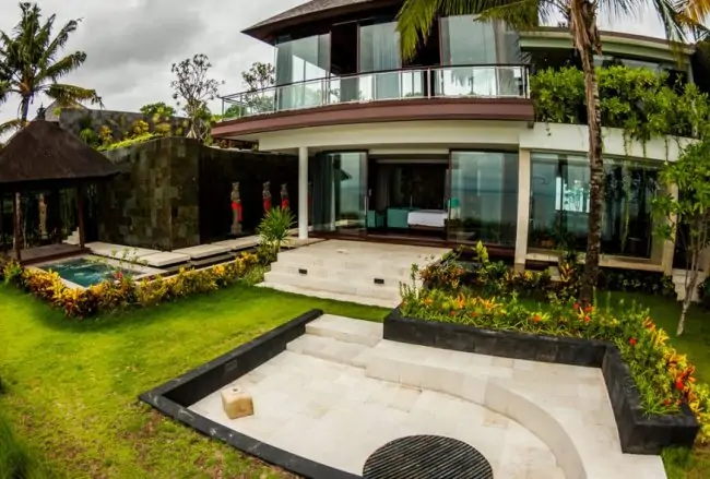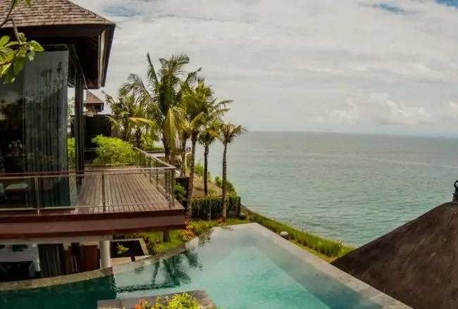 Villa Aum located on the Bali Cliff Top of Balangan Beach, part of community complex with a promenade area and its own beach access, where the iconic Rock Bar located about 1.2 km away. This Clifftop Ocean View Villa of Villa Aum features 4 air-conditioned bedrooms, each bedrooms are furnished with luxurious king-size beds. Master bed is located beneath the living room with glass panels wall overlooking amazing views of the ocean, completed with sofas and TV lounge. Villa Aum room has direct access to the front garden’s fire pit and jacuzzi area. While other three rooms are located behind the main living pavilion and have similar features as the master bedroom en-suite bathrooms with their own bathtubs and showers.