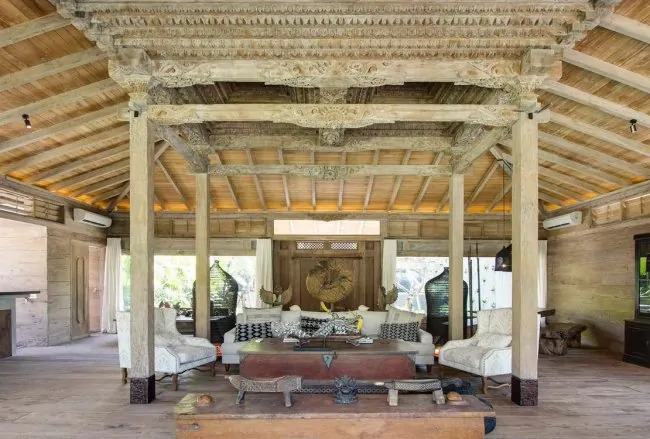 The master suite offers unrivalled luxury and privacy with a California king-size bed positioned below a rare 400-year old joglo carving. Bedside lighting controls are integrated into the teak bedframe and café-style seating is provided at two tables. A sundeck leads to a 12-metre infinity pool and wraps around to a secluded walled courtyard. The bathroom features a huge sunken bath surrounded by a fish-filled pond. A private television room lies behind the master suite.