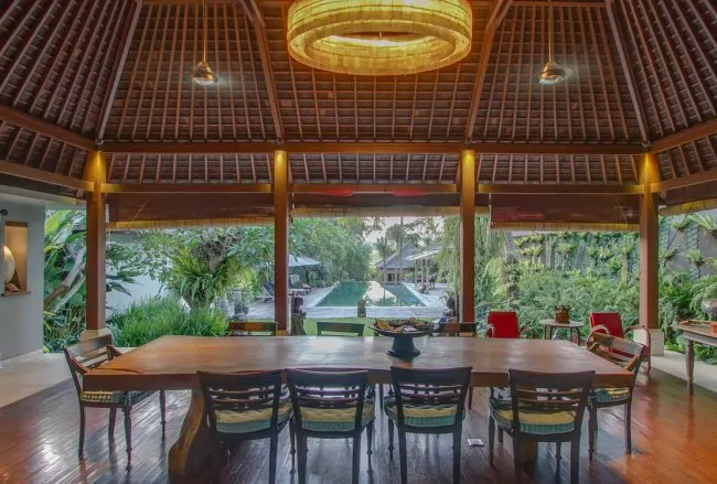 A heavy teak wooden gate and stepping stones over a peaceful pond lead into the breathtaking 400 year old Javanese Joglo, completely hand-crafted and hand-carved out of teak wood and enriched by modern full length glass doors allowing you to enjoy air-conditioned comfort while still keeping the amazing garden view. It is a truly special place that breathes elegance and sophistication with an amazing collection of traditional antiques, interesting artwork and lamps crafted from traditional fish-traps. In the centre there is a luxurious sofa lounge where you can curl up with a book, there is a gorgeous teak wooden dining table and a classy bar-lounge for enjoying drinks. Villa Hansa also features a separate open-plan dining pavilion surrounded by ponds and for entertainment there is an air-conditioned TV lounge.