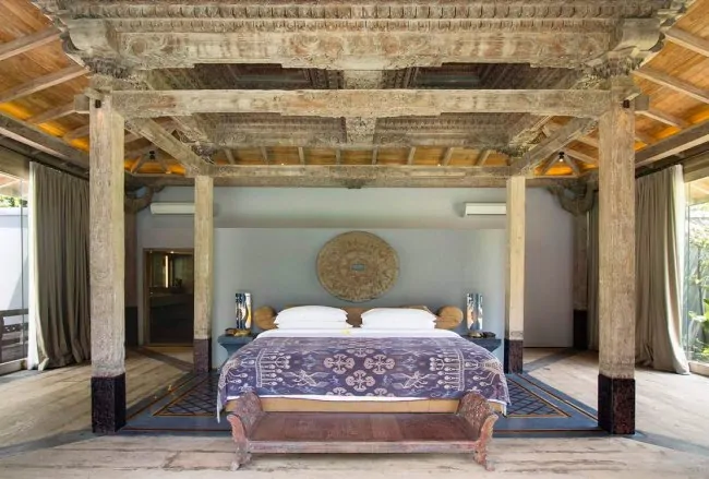 This beautifully holiday villas bali antique Indonesian building makes an ideal kids bedroom. The room features timber shuttered windows and slatted walls plus a sweet veranda. A wonderfully preserved four-poster daybed makes a gorgeous centrepiece to the room, which also has an antique wardrobe, desk and chair plus a cushioned wooden bench seat. The ensuite bathroom is fitted with a rectangular volcanic stone bathtub, unique hand crafted tiles, separate shower and vanity. It is connected to the master suite via the television room.