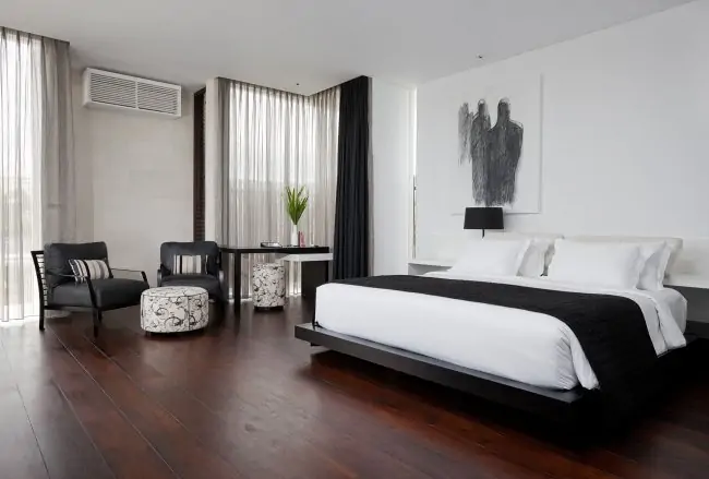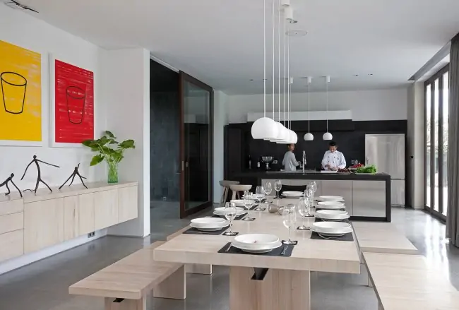 A defining feature of the monochromatic-themed Villa Issi Bali is the perforated steel and wood exterior screen on the upper level, which shades the sun and plays on the shadows, creating a beautiful soft diffused light. The four-bedroom Bali luxury resort comprising the main two-storey building, self-contained two-bedroom guesthouse and stand-alone gym is finished off by a stunning 25 metre infinity edge swimming pool for all guests to enjoy.