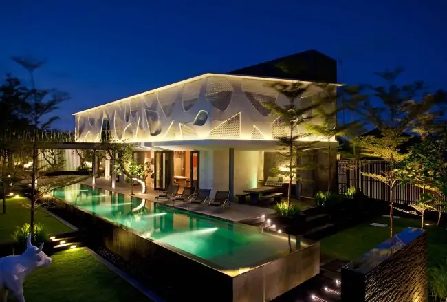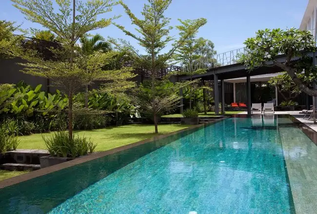 Villa Issi Bali is a contemporary villa set on 1,500 square metres of land designed by International acclaimed and awarded architect Budi Pradono, is surrounded by a serene garden, a four bedroom villa that can accommodate eight people and it features a two storey building, self-contained two bedroom guesthouse, a gym and a magnificent 25-metre pool. Each room is unique and the villa was completed in 2011.