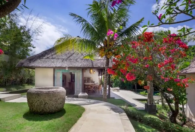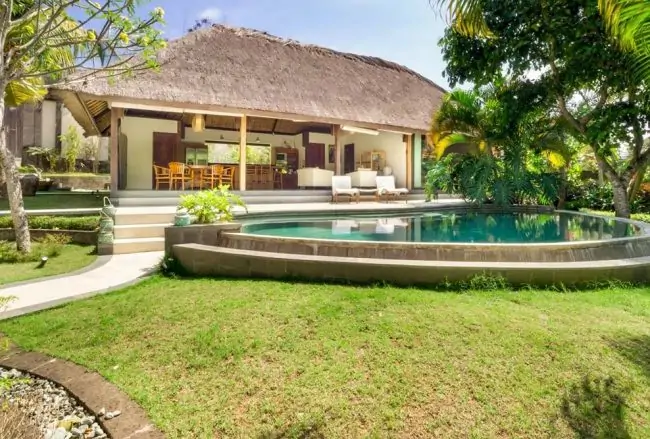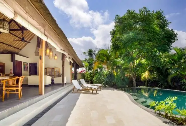 Upon opening the hand-carved teak Javanese wooden doors, guests are welcomed into Villa Lalita’s paradise-like garden. A stone pathway meanders through the green grass, leading to a sun deck and the enticing swimming pool. The garden is adorned with vibrant flowers and tropical greenery, surrounding a lagoon-shaped pool with crystal clear water. The villa offers a perfect blend of sun and shade, complemented by deluxe sun loungers by the poolside.