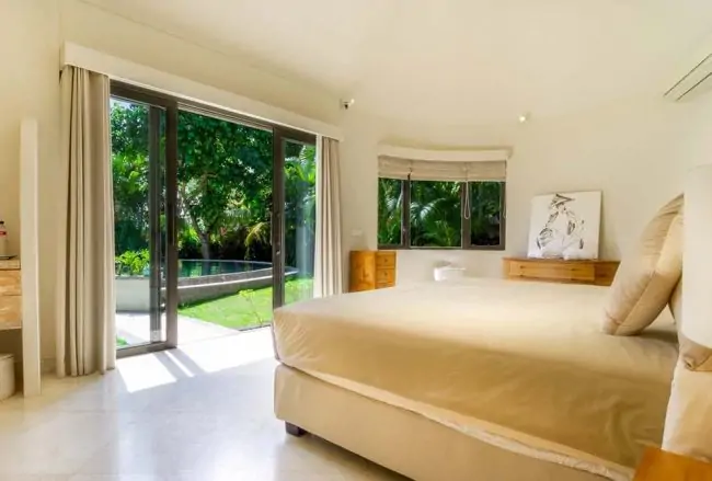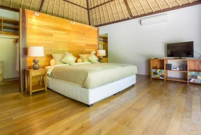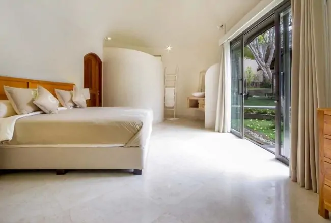 Villa Lalita comprises two bedrooms: a master suite accessed through rear doors in the living room and a guest bedroom nestled in a private, round-shaped garden pavilion. The master suite boasts a spacious design with a high soaring rooftop, teak flooring, a large king-size bed, AC, and a TV. Natural sunlight bathes the room during the day, and behind the bed lies a dressing area. The ensuite bathroom is partially open-air, featuring a sizable soaking river rock bathtub and an outdoor shower.