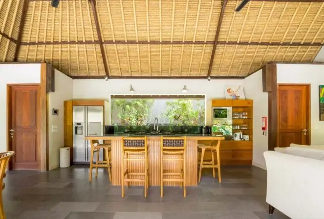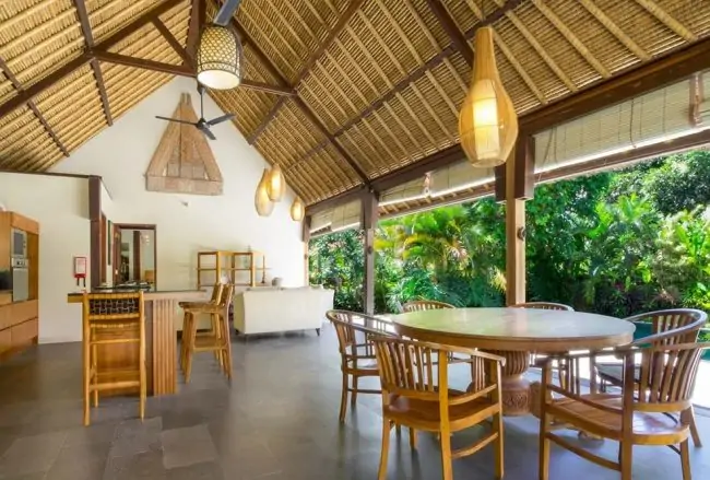 The open-plan pavilion with a soaring thatched rooftop defines the tropical living experience at Villa Lalita. The living room features comfortable white sofas, a round teak dining table for six, and a well-equipped western-style kitchen with a bar and stools.