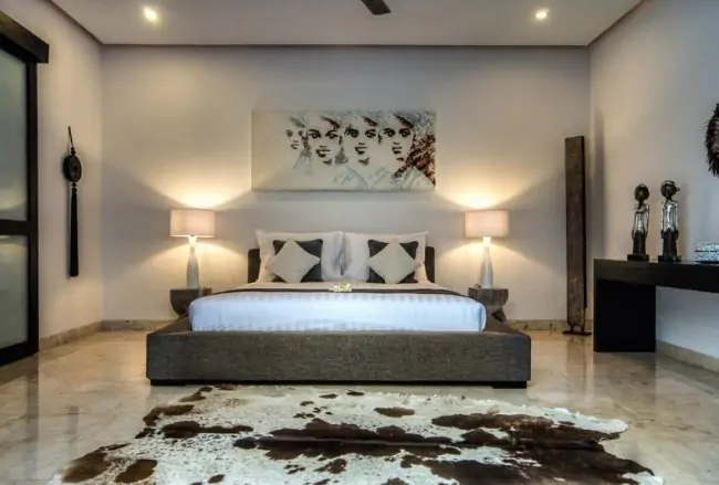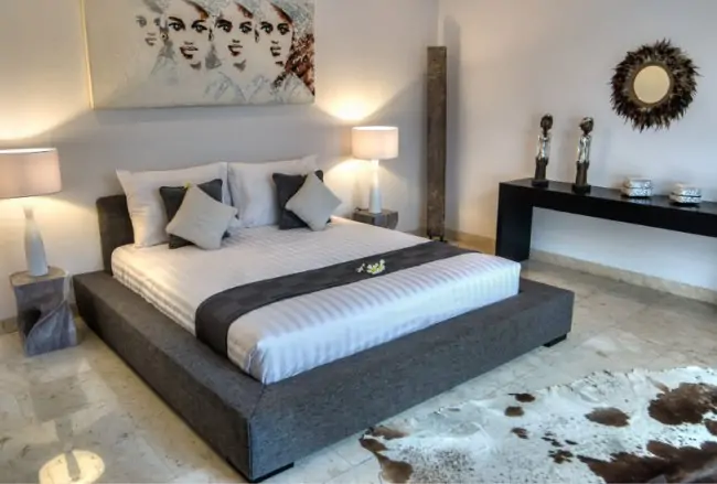 This Seminyak villas rental stylishly decorated air-conditioned bedroom, which also has a ceiling fan, boasts a king-size bed and a marble ensuite with bathtub and large rain shower. Villa Lanai Seminyak is also available to rent as a one-bedroom villa.