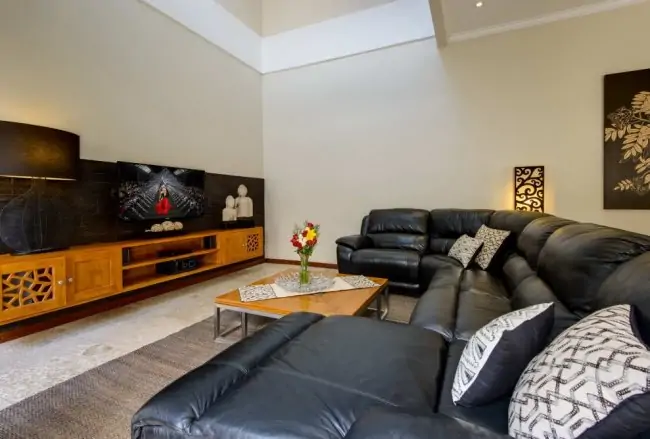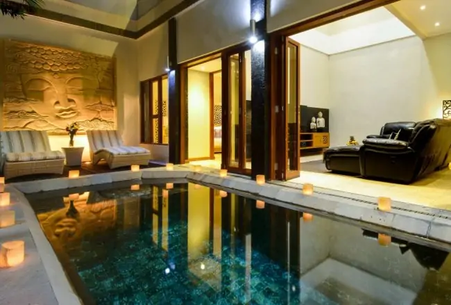 This Legian villa of Villa Michelina is built over two levels with the kitchen, living and dining area located on the first floor and are fully air conditioned and open out to the pool area via by-fold doors. A master size 2nd bedroom is also positioned on this level with its own en suite bathroom and views over the pool. Accommodation upstairs comprises a very spacious master bedroom with its own private sitting room, walk-in robe and en suite.