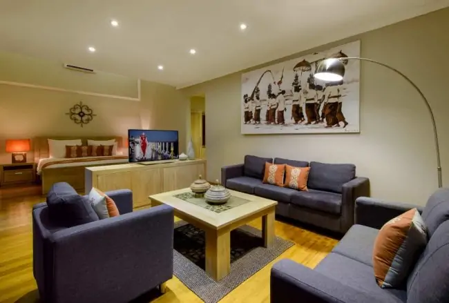 Also located upstairs is a uniquely designed 3rd bedroom which features a three quarter ceiling height dividing wall which separates twin king size singles bed each with their own walk-in wardrobes and a shared ensuite. Each bed also has their own wall mounted flat screen TV making this room ideal for teenage children or friends sharing.