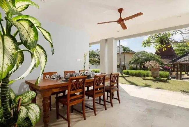 The spacious and grand living room in the five-bedroom villa serves as an ideal gathering place for larger groups. Whether you’re celebrating a special occasion or simply enjoying quality time together, this living room offers the perfect setting. The elegant wooden doors and intricate Balinese carvings contribute to the overall charm of the space.