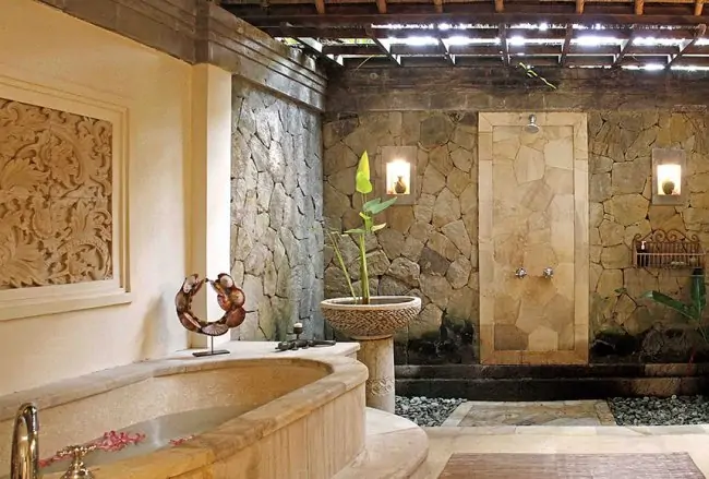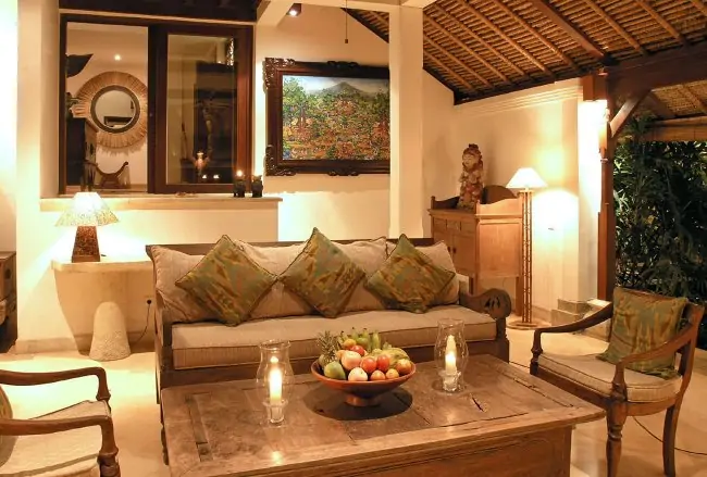 Stone stairs lead down from the villa entrance foyer to the spacious, open-air, traditional Balinese style living and dining pavilion. From here you will enjoy one of the most spectacular views in all of Bali – the beautiful Sayan Valley. The villa is furnished with Indonesian antique furniture and artifacts, traditional hand woven textiles and local Balinese crafts.