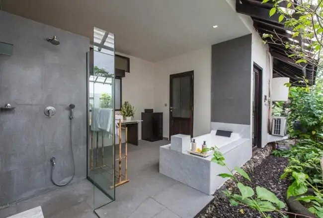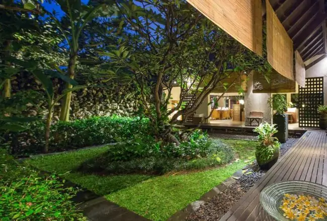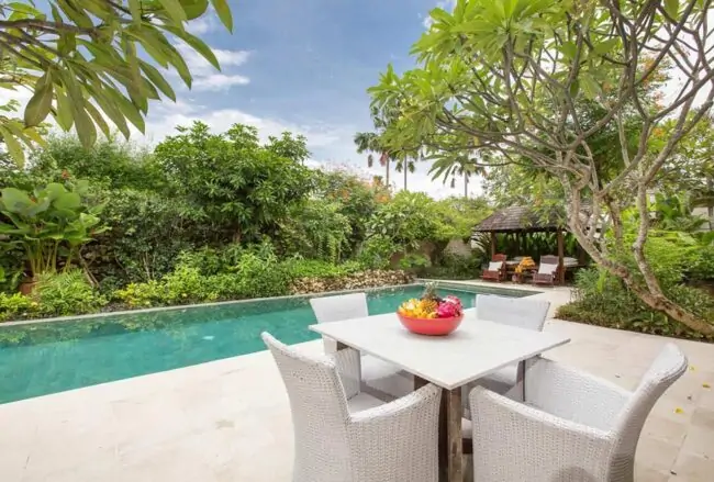 The outdoor and pool areas of Roku Villa in Seminyak exude a tropical ambiance with beautiful decorations, creating a tranquil holiday atmosphere. The villa seamlessly combines Balinese style with modern amenities, featuring a sizable swimming pool amidst stunning Balinese-inspired surroundings. The meticulously designed decor and tropical ambiance offer a peaceful retreat from the bustling Seminyak.