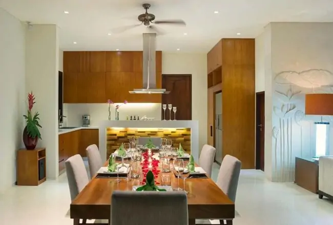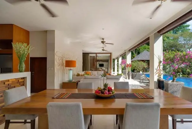 The upper floor of Villa Shinta Dewi Ubud features beautifully decorated, ensuite, and air-conditioned bedrooms with stunning views of the pool and garden. A spacious lounge complements the upper floor’s elegant design. On the ground floor, a modern open dry kitchen, main dining area, an adjacent lounge, the fourth bedroom (convertible to a closed lounge or study), and a gym provide a seamless living experience. A wet kitchen and laundry room are discreetly positioned at the villa’s rear.