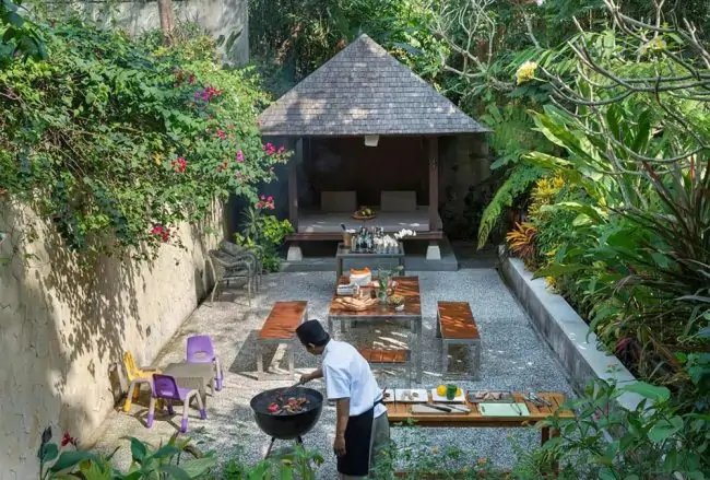The 16 x 5.5m pool, located just 2m in front of the villa, adds a touch of serenity to the surroundings. A Bale (gazebo) at one end of the pool offers a perfect spot for a light meal, reading, or simply enjoying the views. The Sungai (River) Terrace, positioned between the lawn and the river below, provides a peaceful retreat with the soothing sounds of running water. Another Bale at one end is ideal for yoga or meditation, while the barbecue area in the center, with outdoor seating for ten, adds a touch of versatility. The border to the river boasts magnificent trees and colorful flowers, creating a natural haven for guests to unwind and connect with nature. Shinta Dewi Ubud Villas is a haven that seamlessly blends luxury, nature, and tranquility for an unforgettable Ubud experience.