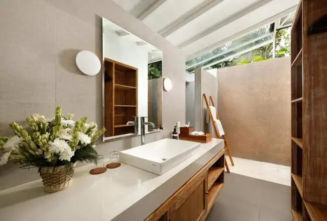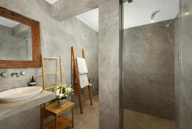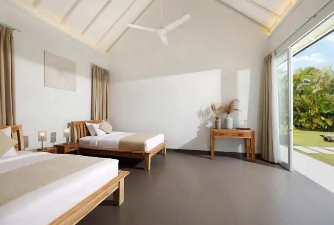 With five bedrooms spread across two pavilions, four of them with en-suite bathrooms, each room features a queen-size bed, and one includes an extra twin bed, along with a spacious bathroom. The atmosphere is serene with neutral white and earthy tones. The master and second bedrooms on the top floor showcase a traditional Balinese thatched roof and open to a balcony. The bathrooms feature bathtubs positioned next to walls with geometric cut-outs for ample natural air and light. The remaining three bedrooms on the ground floor open to the garden courtyard, and all bathrooms are equipped with luxurious resort-style amenities.