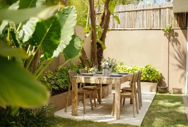 In the garden courtyard, there’s a captivating swimming pool at the center, with a sun deck featuring lounges and parasols. Lush greenery surrounds this area, and a central walkway divides the courtyard into two parts, leading to the main lounge room. An outdoor dining area is tucked around the corner as a pleasant surprise. Upstairs balconies provide charming spots for breakfast or tea with a garden view.