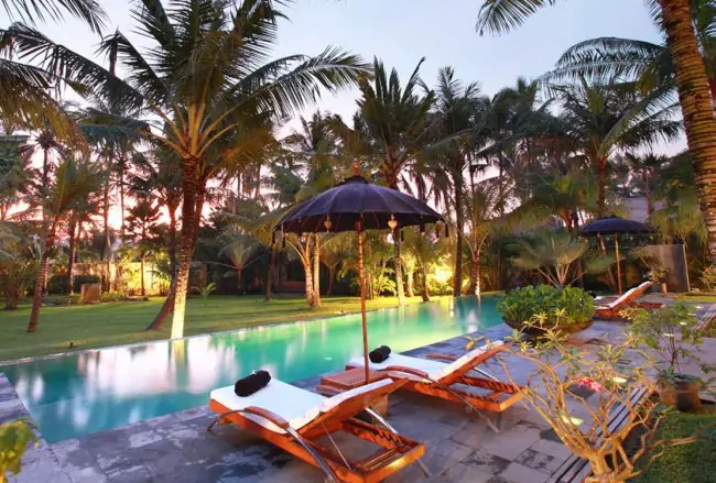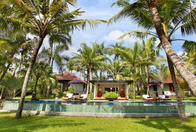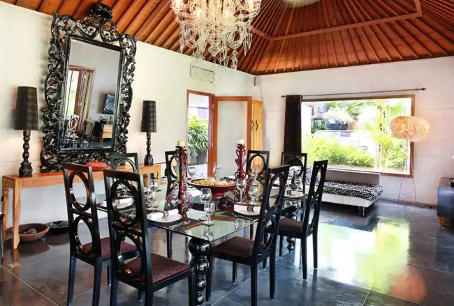 The salient features of Villa Valentine are its 3000 sq metre lush gardens with innumerable coconut trees, offering an expansive tropical design and plenty of space to spread out. The villa has a magnificent 15 metre swimming pool surrounded by cosy daybeds and a soothing pool bale. A Buddha statue overlooks the pool, symbolising peace and harmony. Apart from this, the villa has an ornate private temple, stone sculptures and plenty of water features adding to the outdoor serenity. The villa also offers free Canggu Club membership to its guests to make use of club facilities.