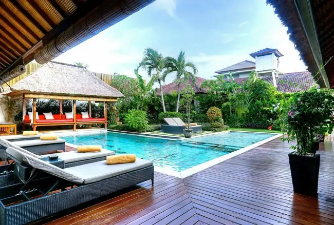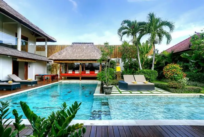 Villa Vie seminyak features 5 bedrooms, 4 bathrooms, 2 bedrooms on second floor sharing a bathroom. A massive open style living with direct access to the deck, garden and lovely L-shape swimming pool. An additional seperate 1 bedroom with private plunge pool available, make a total 6 bedrooms.